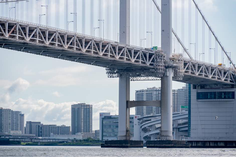 Completed in 1993, Rainbow Bridge connects Shibaura and Odaiba and stands as the largest suspension bridge in the Tokyo metropolitan area. With its towers rising 126 meters above the sea and a length of 798 meters, it’s officially called the Tokyo Port Connecting Bridge. The bridge accommodates the Yurikamome line, Metropolitan Expressway Route No.11 Daiba Line, and pedestrian pathways. The bridge’s lighting display runs year-round, with different patterns in summer and winter.