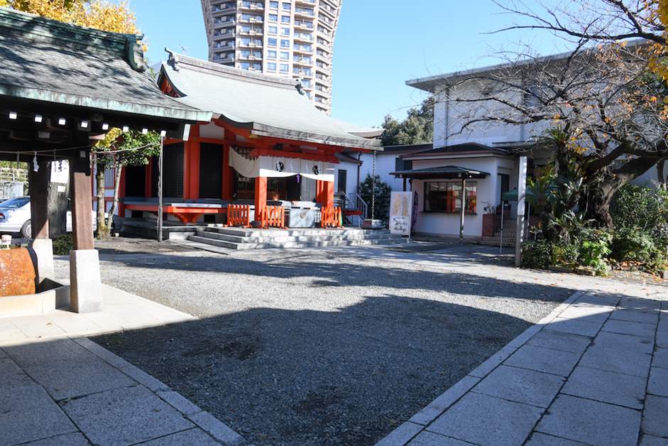 A seven-minute walk from JR Hamamatsucho Station. The large, white-colored Torii gate awaits us at the calming Shiba Daijingu. The shrine is famous in the Kabuki community as the setting of "Megumi no Kenka."