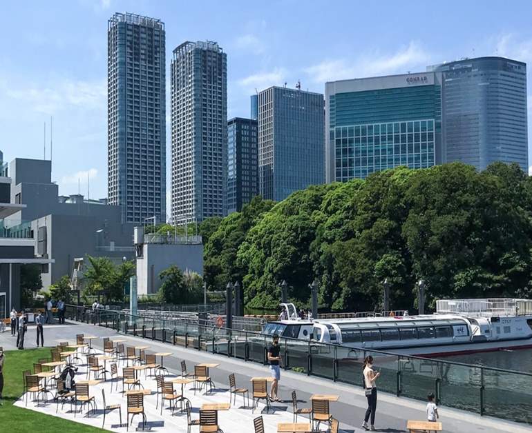 The Takeshiba Tideland near the plaza is used as a place for environmental conservation and restoration initiatives, to help creatures that once inhabited the Tokyo Bay may return to the area. Come out and relax here, where nature and the city merge, surrounded by greenery and water.