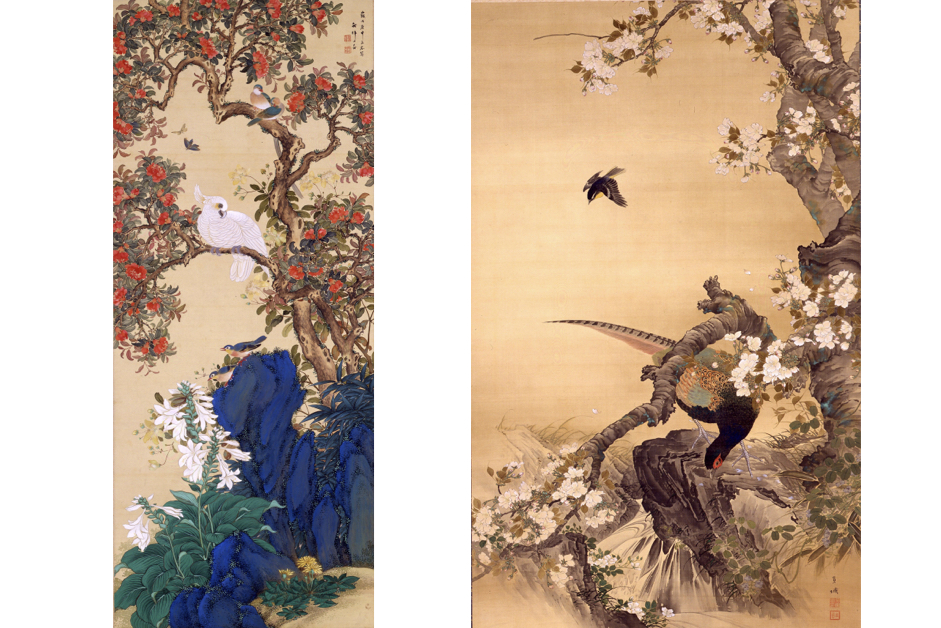 Left: "Pomegranate Flower and White Parrot" by Shuhei Yamada, 1920, Sen-Oku Hakukokan Museum Tokyo Right: "Flowers and Birds of Spring and Autumn" by Naoki Fukada, late 19c to early 20c, Sen-Oku Hakukokan Museum Tokyo