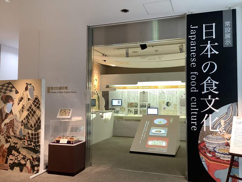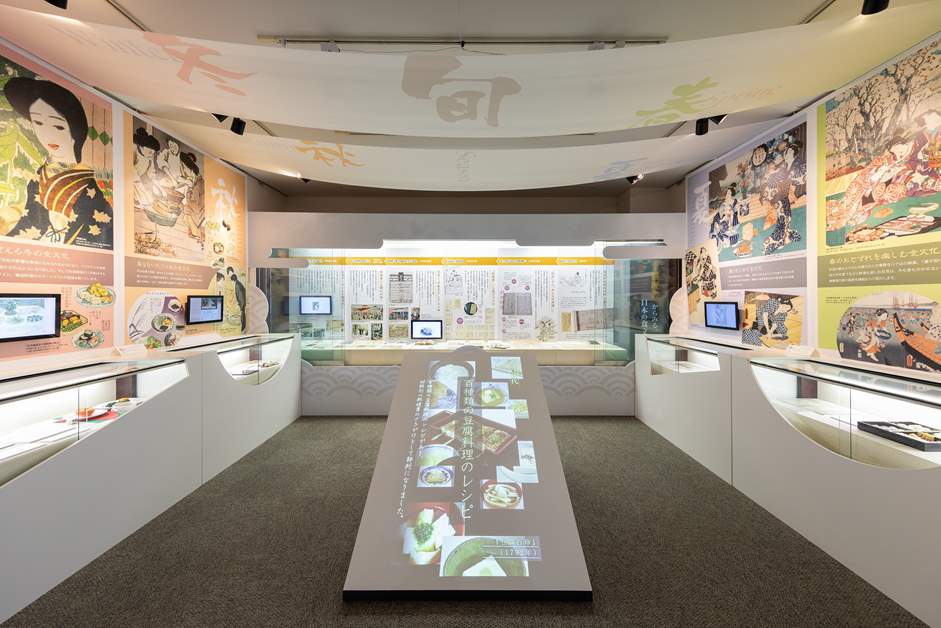 The "Food Culture Exhibition Room" on the second floor of the Food Culture Library introduces Japan's food culture, which has been nurtured with the four seasons since ancient times, through 'Ryori Monogatari,' Japan's oldest recipe book, and 'Tofu Hyakuchin,' a collection of 100 tofu dishes, as well as food samples reproducing old dishes. On the same floor, the "Small Museum of Food and Life" (operated by Ajinomoto Co., Ltd.) offers an exhibition where visitors can learn about the changes in food culture since the Meiji Era and the history of The Ajinomoto Group while viewing a space that reproduces dining scenes from each era.