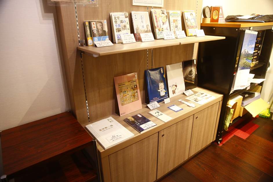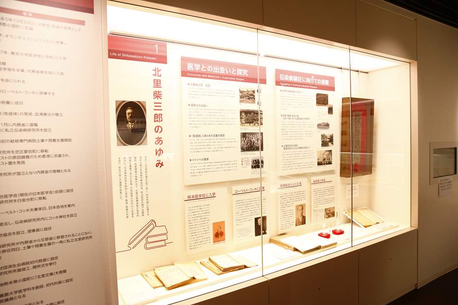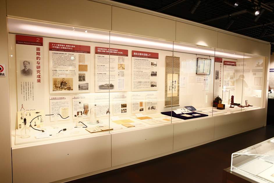 The Shibasaburo Kitasato Memorial Office, located on the Shirokane Campus of the Kitasato Institute Educational Corporation, is about a 10-minute walk from Shirokane-Takanawa Station. Buses are also available from Shibuya, Hiroo, Ebisu, and Tamachi stations, with the nearest bus stop being in front of the Kitasato Institute. The exhibition room was located on the first floor of the two-story Kitasato Shibasaburo Memorial Hall, which was completed in 2017. On the exterior wall of the memorial hall, the main building of the Kitasato Institute, founded by Dr. Kitasato, is depicted using a special process. The concrete construction method is sometimes visited by building officials to observe this process.