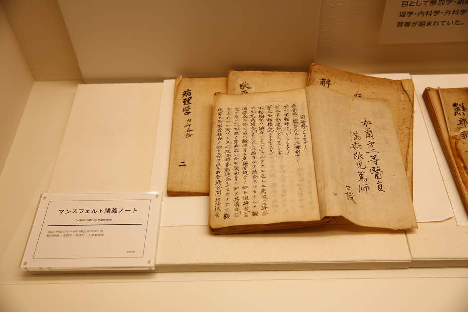 In the first area, visitors can look back on Dr. Kitasato's life from his childhood to his later years through a chronology and photos of the time. Born and raised in Oguni Town, Aso County, Kumamoto Prefecture, Kyushu, Shibasaburo dreamed of becoming a soldier or a politician when the Meiji Restoration came, but his parents strongly advised him to enter Kumamoto Medical School. Here he met a Dutch military doctor, Mansfeldt, and under his guidance, he opened his eyes to the fascinating world of medicine.