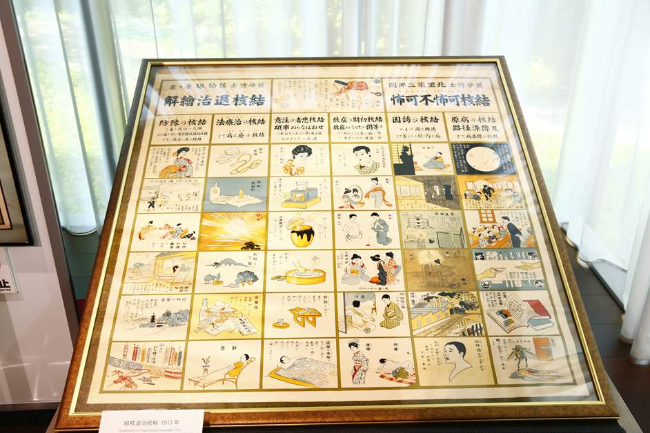 A replica of the culture device is on display along with an introduction to Dr. Kitasato's research findings.
