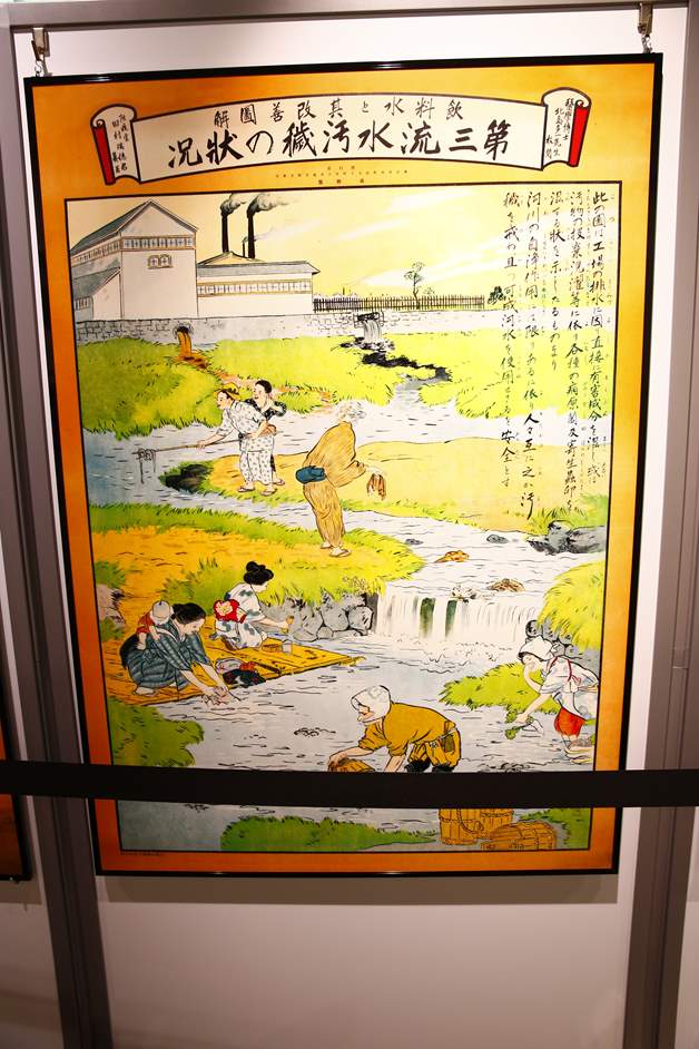 Dr. Kitasato, who considered raising the public's hygiene awareness important, also devoted himself to educational activities. One such effort was a poster for the prevention of infectious diseases. Typhoid, dysentery, and cholera bacteria in a contaminated river. The posters, which visualize pathogenic bacteria, have a great impact! Please take a closer look.