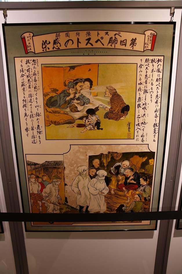 When the plague bacillus enters the human lung, it becomes pneumonic plague, which can be transmitted from person to person by droplets. The poster depicts people wearing protective clothing and the importance of social distance, reminiscent of recent new coronavirus infections.
