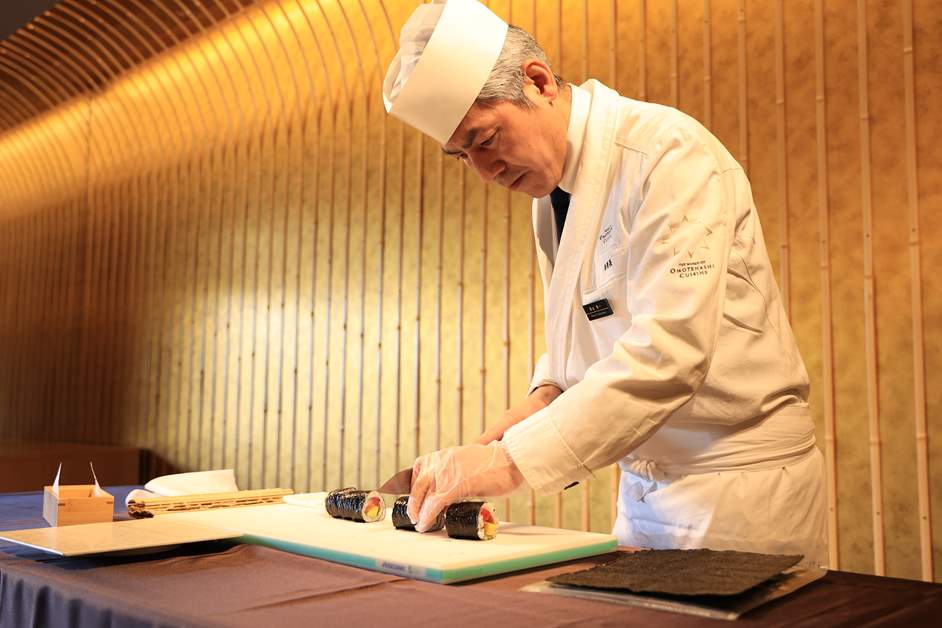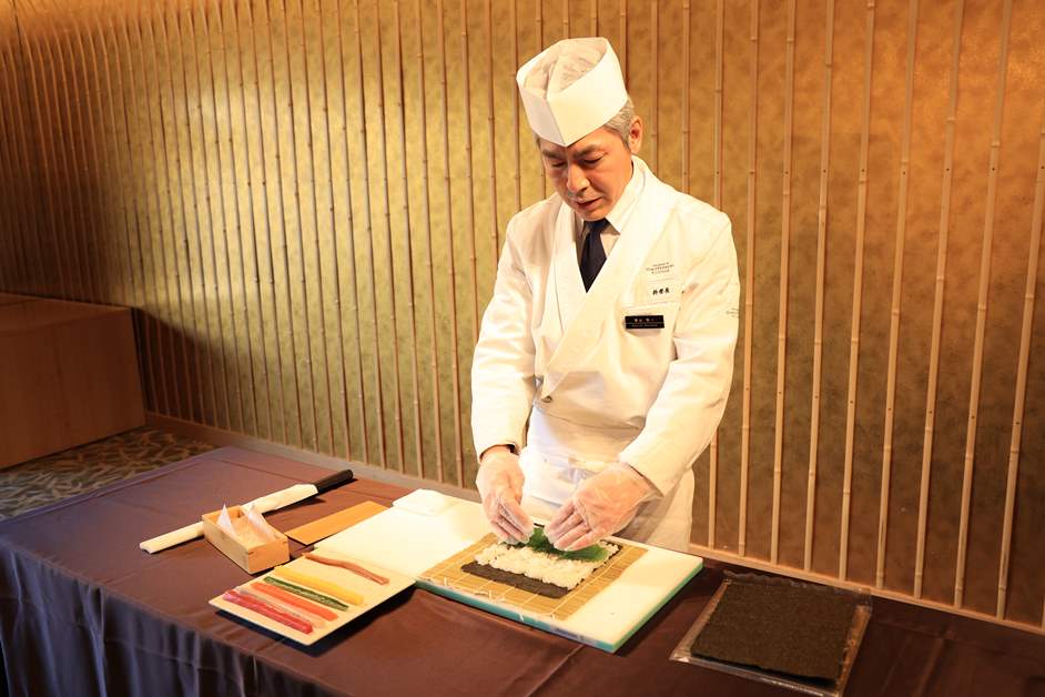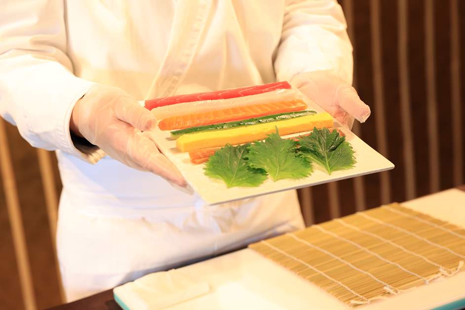 After the "Tea Ceremony Experience," the next activity held in the main banquet hall is the "Hand-rolled Sushi Experience" group activity. Happo-en's Japanese cuisine chef will provide instructions on making hand-rolled sushi using fresh ingredients. On this day, the ingredients included shiso (perilla), kanpyo (dried gourd strips), tamago (sweet omelet), cucumber, salmon, yellowtail, and tuna, for a total of 7 types of ingredients.