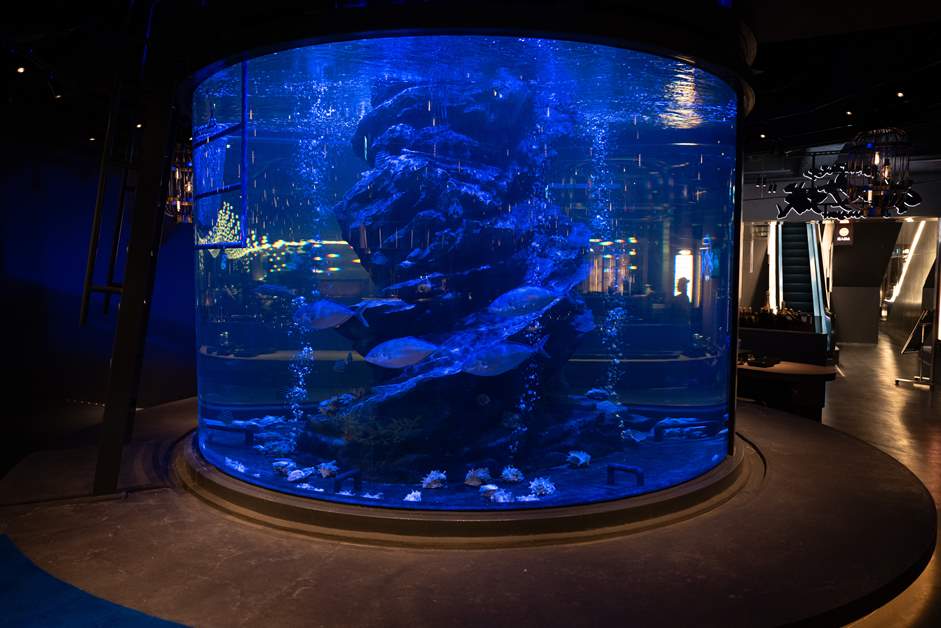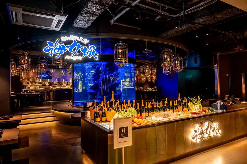 First, we head to the basement floor. At Amajoh, a restaurant with a massive 20-ton tank at its center, guests can savor a meal while experiencing the culture of ama divers, part of Japanese cultural heritage.