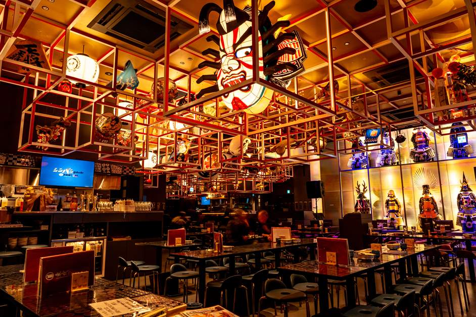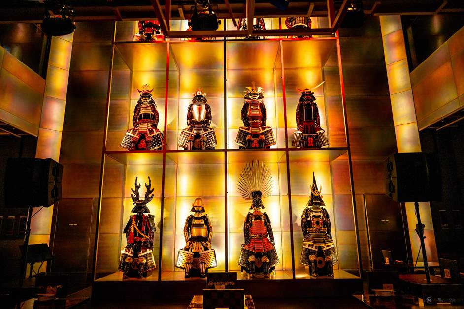 The diverse samurai armor creates a perfect spot for snapping photos. The ceiling is adorned with quintessentially Japanese items - from taiko drums and nebuta floats to lanterns, sake barrels, daruma dolls, and shogi pieces - creating a space that exudes the festivals and culture of Japan.