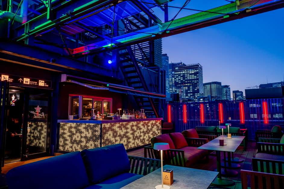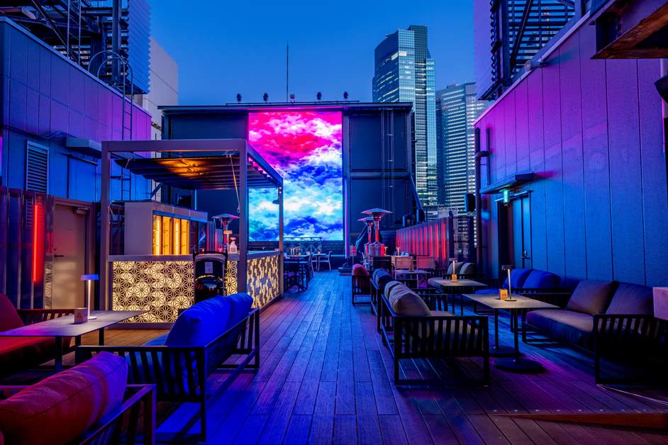 The top floor, the eighth level, features Tatami, a bar that offers rare Japanese sake and Kyoto Uji matcha sweets, as well as Rainbow Star, a rooftop barbecue restaurant. The vast rooftop includes a large LED screen system that allows for events using multimedia.