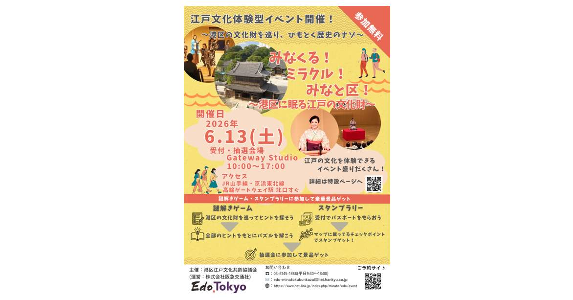A one-day itinerant event will be held to visit, learn, experience, and enjoy the cultural properties of Edo in Minato Ward.