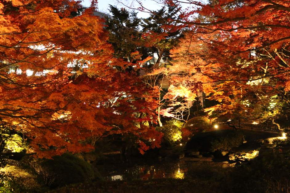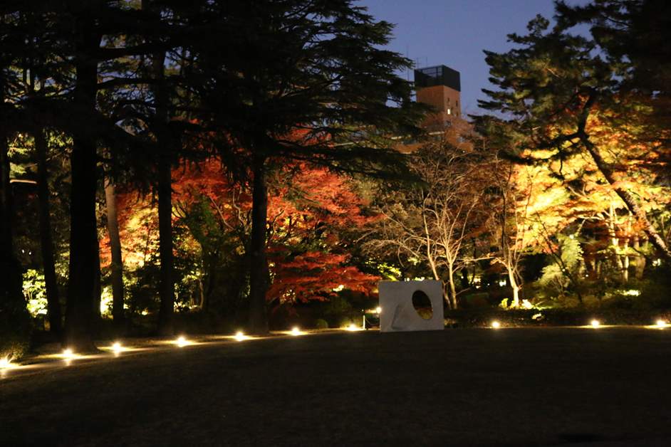 夕刻を過ぎると、旧朝香宮邸がライトアップされるほか、日本庭園では彩られた紅葉が池の水面に照らされ、目を見張るような幻想的な光景が出現します。