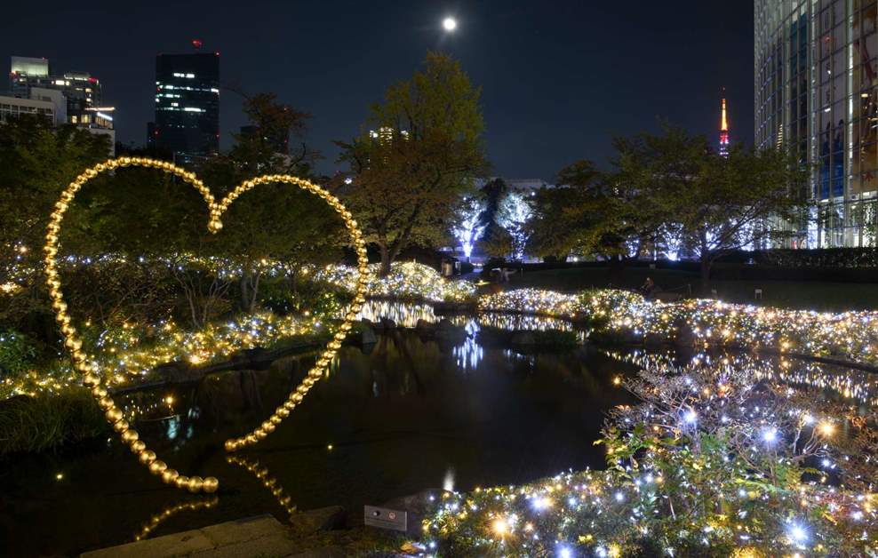 毛利庭園のイルミネーションは、池の周りを光が染める上品な印象。カラフルな光の粒が水面にも映し出されて幻想的な風景に。ハート型のオブジェ「Kin no Kokoro」も、ほっこりした気分を誘ってくれます。