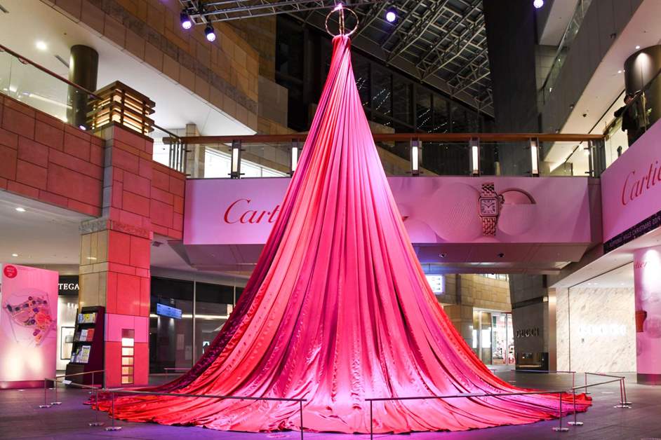 ウエストウォークでは、フォトジェニックなクリスマスツリーが見ごたえあり。真紅に染まるドレープのドレスをまとった女性のように立つゴージャスなツリー。流線的なひだが美しいツリーは全体の色合いとひだの陰影がライティングによって変わり、見ている人に優雅なひと時を与えます。
