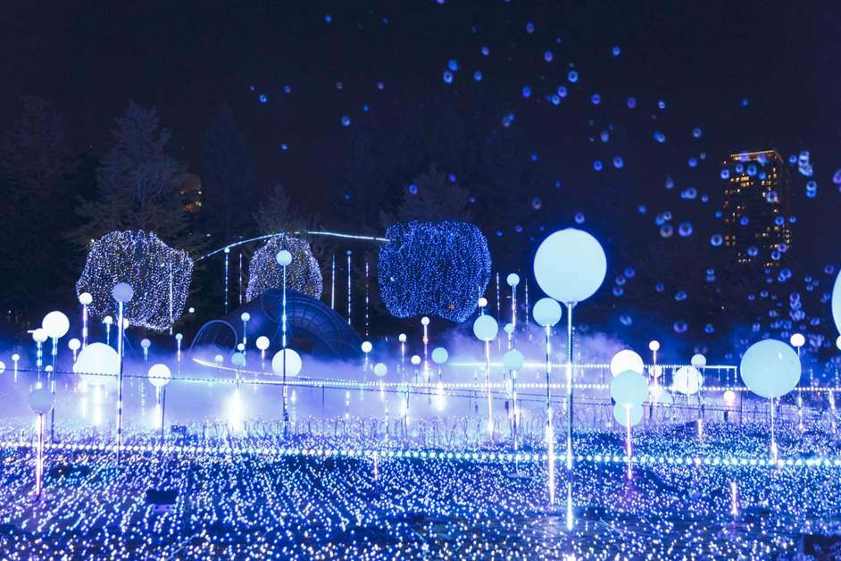 約100個のスターバルーンが空間全体に動きを与えるほか、今年は高さ8mの「Space Tower」が初登場。従来のパノラミックな見晴らしに重層的な美しさを加えるだけでなく、あふれでるミストが星雲を演出します。11月26日から12月18日までの約4週間は、2種類のしゃぼん玉が光の中を舞う「しゃぼん玉イルミネーション」を17時以降から1時間に5回開催。さまざまな演出でこれまで以上にダイナミックになったスターライトガーデンは必見です。