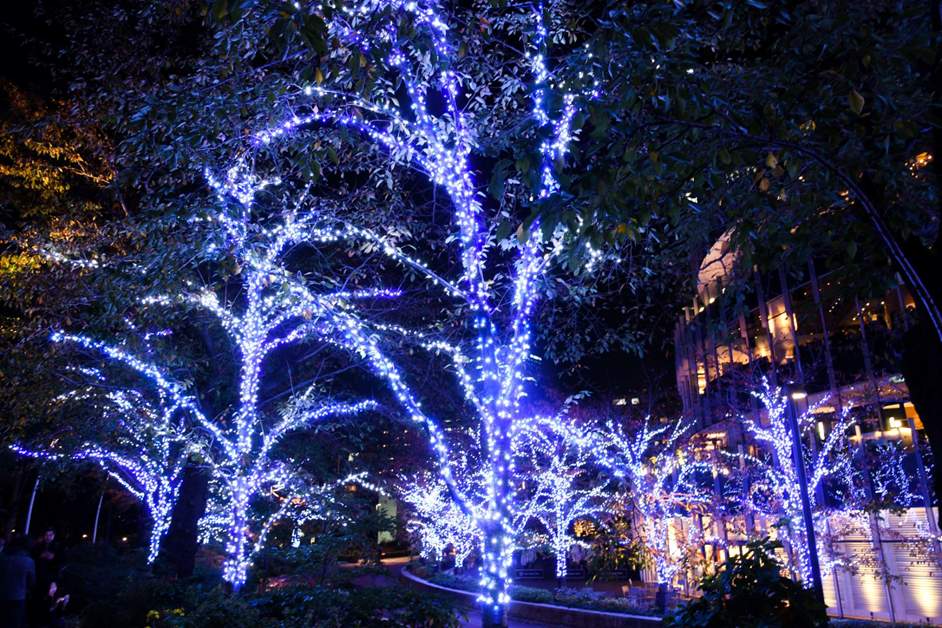 点灯時間:けやき坂イルミネーション・毛利庭園イルミネーション 17:00〜23:00(12月13日〜12月25日の期間中は24:00まで延長して点灯)