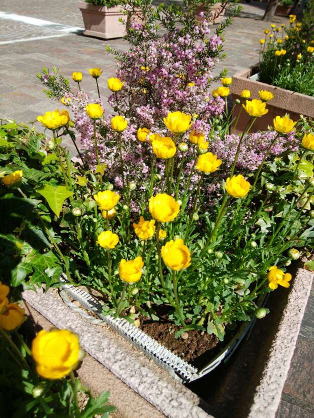 「イタリア街」として開発されている汐留シオサイト5区。西洋を思わせるカラフルな見た目のビル群や石畳の歩道がイタリアの歴史ある旧市街の趣を感じさせます。さらに春は、整然と並び立つクスノキの街路樹が新葉を芽吹かせる時期。プランターの花々と相まって独特の情景が生み出されます。