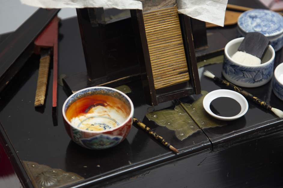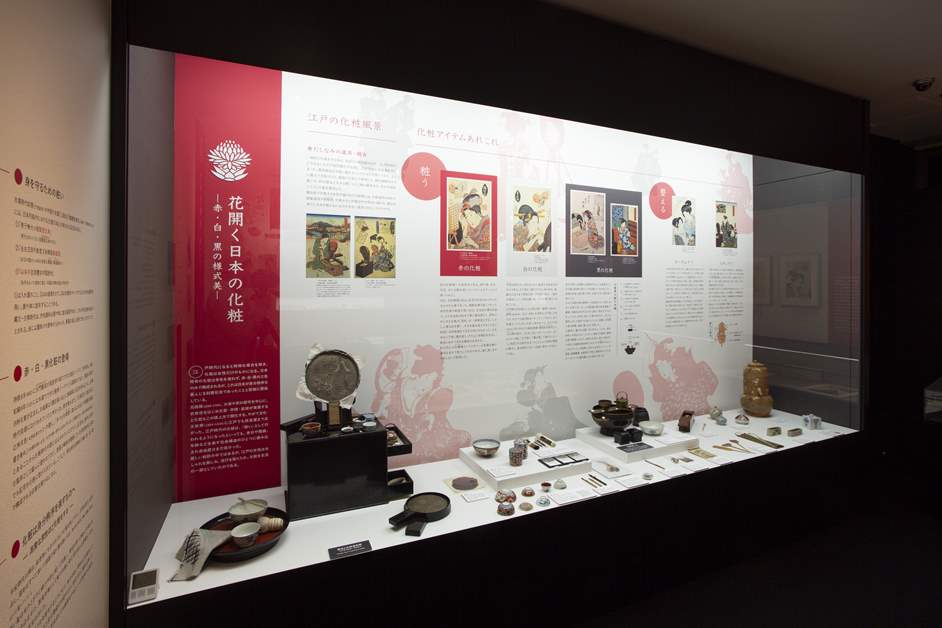 もう一方の展示室には「『化粧』の歩み」をテーマに、主に江戸時代を中心とした化粧文化の歴史を紹介。赤、白、黒の三色のみだった江戸時代の化粧がそれぞれどんな場面で使い分けられたのか、当時の女性たちはどんな風に化粧を楽しんでいたのかという点を浮世絵や実際の化粧道具を見ながら知ることができます。近代に入った明治時代から昭和時代の頬紅や口紅の変遷を辿る展示もなかなか圧巻です。