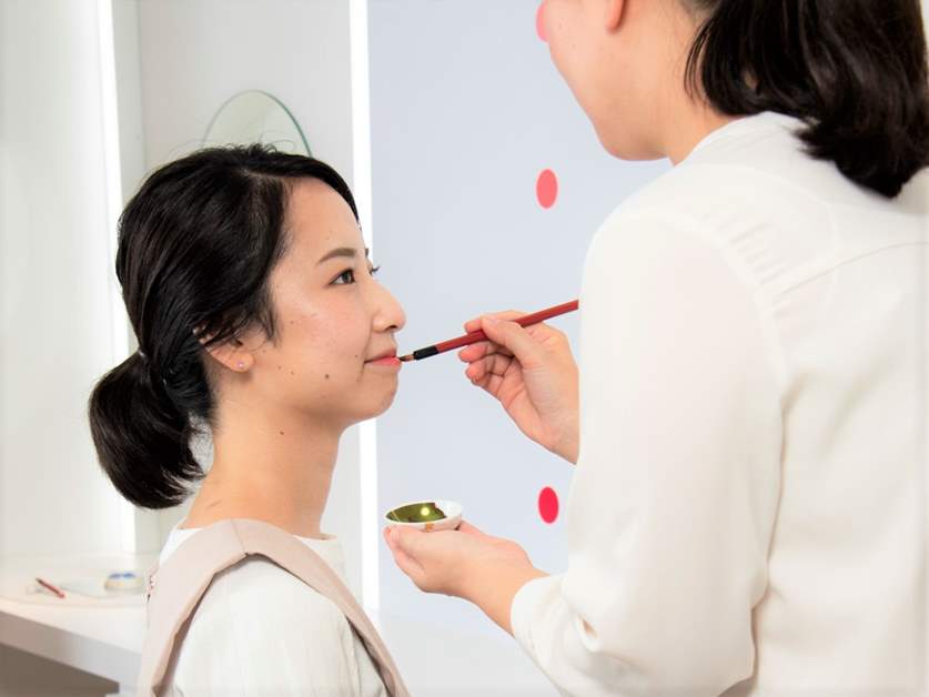 また、併設のコミュニケーションルームでは、小町紅の無料体験が可能。お猪口に塗られて玉虫色に変化した本物の紅が生で見られるだけでなく、実際に塗ってもらうことができます。「男性でも体験される方がいらっしゃますよ」と担当者の方。ぜひ、自分の肌で伝統を感じてみてください。