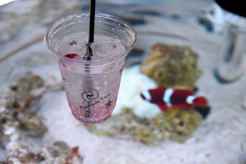 順路をそのまま進んでいくと「コーラルカフェバー」に到着します。イベント限定のオリジナルメニューも楽しめるカフェバーには、美しい発光サンゴの水槽が連なります。サンゴのほかにもフロアに並ぶ3つの円柱水槽を眺めながら、おしゃれな雰囲気の中でちょっとブレイクを。