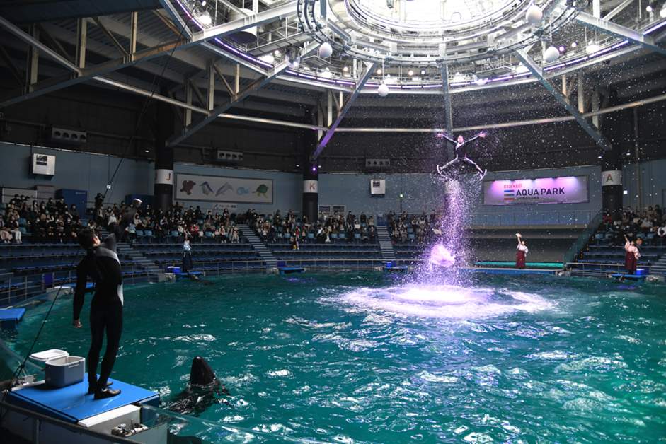 そして、アクアパークの目玉のひとつである「ザ スタジアム」のドルフィンパフォーマンスです。時期によりことなりますが、パフォーマンスの開催回数1日6〜8回。季節ごとにテーマが変わり、日没後はナイトバージョンの演出が楽しめます。