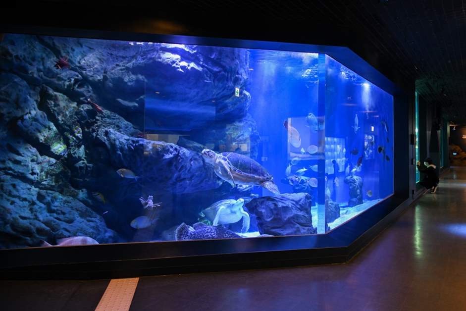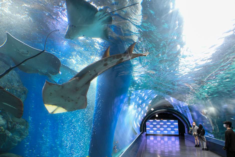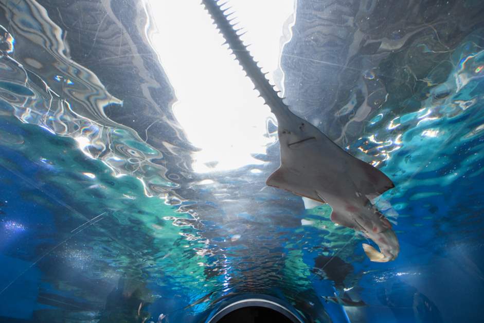 マンタをはじめとするエイの仲間が頭上を泳ぐ海中トンネル「ワンダーチューブ」は“エモい写真”が撮れるポイント。息を呑む感動の空間の中で、ドワーフソーフィッシュが展示されているのは世界の水族館の中で何とここだけという希少な生き物です。一見、そのノコギリのような口先に圧倒されますが、下から見上げてみると小さな目と真一文字の口の意外と(!?)愛嬌のある表情が拝めます。