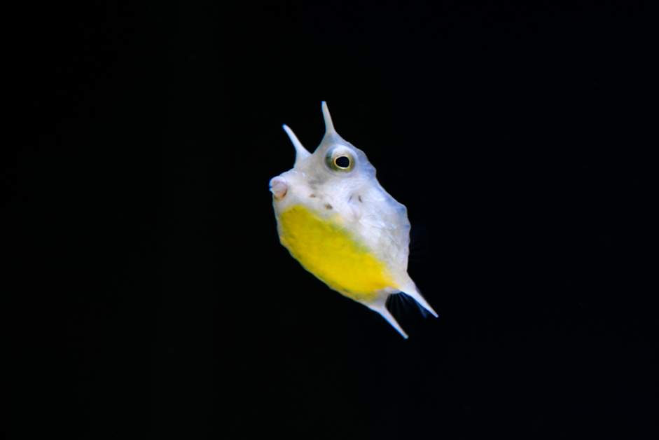 左右の水槽に熱帯魚やサメが見られ、一部の水槽は定期的にテーマが変わる「リトルパラダイス」。カクレクマノミやチンアナゴなどかわいい生き物がひしめく中で、最も心つかまれた生き物がコンゴウフグです。稚魚は手の平に収まるくらいのサイズで、つぶらな瞳とおちょぼ口にキュンとなるかわいらしさ。でも皮膚に毒を持っているという、見た目とは違って強い生き物。