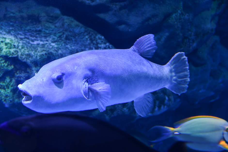 同じく「ワイルドストリート」で見られるモヨウフグ。大きなウミガメも暮らす水槽の中をゆっくりと移動しながら、泳いでいるというよりも漂っているという言葉が似合う生き物です。ずっと口をポカンと開けていて、ちょっととぼけたような表情に癒されます。