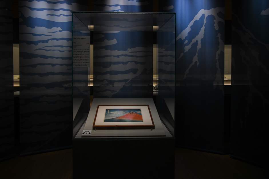 入り口に設けられた象徴展示では、さっそく北斎の代表作のひとつである《冨嶽三十六景》の《凱風快晴》が見られます。“世界一摺られた版画”とも言われ、おそらく富士山が描かれた絵の中で世界一有名な本作。青空の下で映える“赤富士”は、日本人のDNAの中に刻まれている光景といっても過言ではありません。