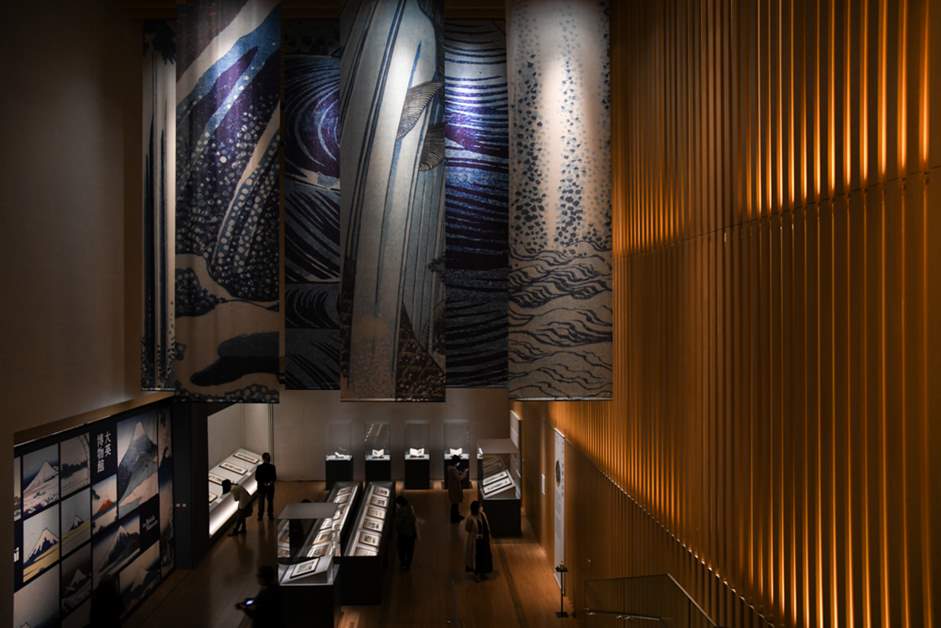 18点が並ぶ《冨嶽三十六景》の展示は、“北斎ブルー”とも呼ばれるベロ藍を主体に摺られた初期の作品から徐々に色の数が増えていった後期までの流れが分かる内容。鑑賞者の姿が常に絶えない展示ケースの中には、北斎作品で3本の指に入る代表作《神奈川沖浪裏》が。その近くには先ほどの《凱風快晴》と一対で語られることも多い“黒富士”こと《山下白雨》も展示されています。