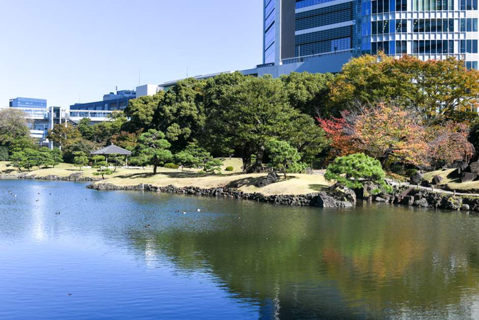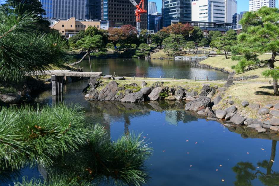 ビルから外に出ると、右手には高架上を新幹線や電車が行き交うJR浜松町駅、左手には東京タワーを背景にした芝・大門エリアの街並みが見えてきます。まずは右手の方へ進んで、JR浜松町駅のすぐ隣にある「旧芝離宮恩賜庭園」を訪れてみたいと思います。
