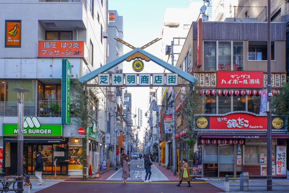 旧芝離宮恩賜庭園を見終えたら、今度は東京タワーのある方向に向かっていきましょう。浜松町駅の界隈は昔からのオフィス街でもあるので、平日の日中はビジネスパーソンと観光客が入り混じる忙しない空気が流れています。そのため、働く人のお腹を満たすグルメスポットが多いのも特徴。たとえば、一つ目の交差点を渡って右手にある「芝神明商店街」も人気の飲食店が集まる界隈です。