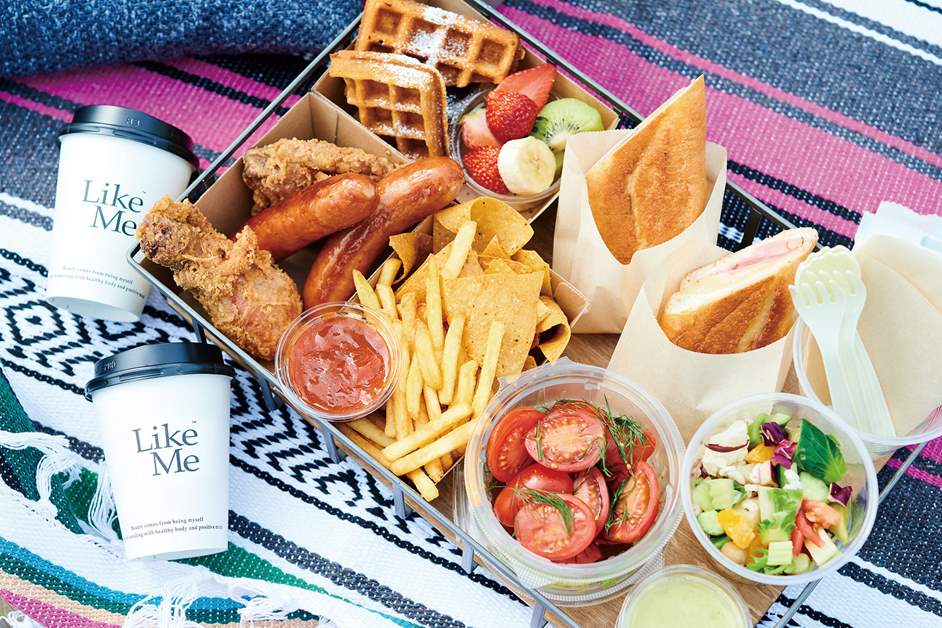ピクニックセットの内容は、グリルチーズサンド、フレンチフライ、ナチョス、フライドチキン、ソーセージ、サラダ、ピクルス、全粒粉ワッフル、フルーツ。食事からおつまみ、サラダ、デザートまで盛りだくさんに揃っています。