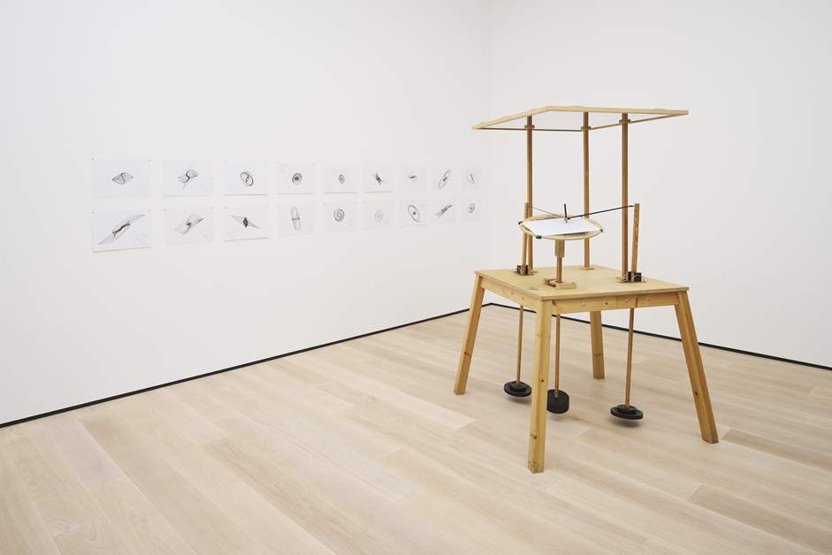3つの多面体で構成されたオレンジ色の《蛍の生物圏(マグマの流星)》や、振り子の原理を用いてドローイングを生成する《終わりなき研究》などの作品からも、エリアソン氏のインスピレーションの高さを伺い知ることができます。