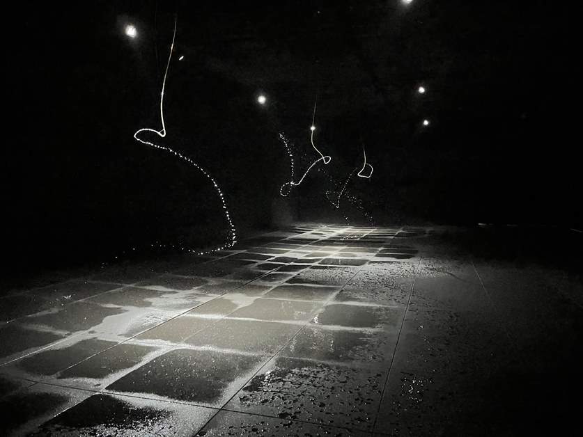 本展の目玉の一つとも言えるのが、水を用いた大型インスタレーション《瞬間の家》。高さ5m、全長20m以上の暗闇の空間に、ストロボの光で瞬間的に照らされた水が踊ります。この作品は、2010 年に発表された作品を本展に合わせて再構成したもの。不規則に生み出される水の曲線は、いつまででも見ていたくなります。