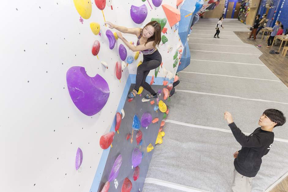広さ約100坪の広々としたエリア内には、ゆるい傾斜から、最大145°の厳しい傾斜まで、多彩な壁が並びます。初めての方にはスタッフが丁寧にレクチャーしてくれるので、何も心配はいりません。