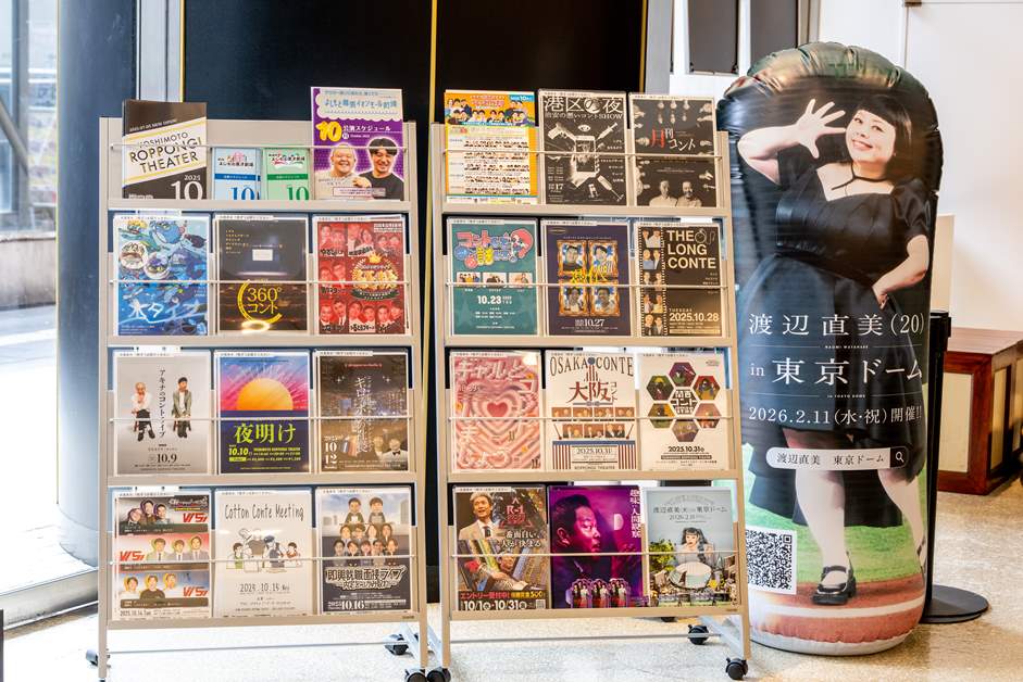 若手コント師たちによる新ネタの合同ライブから、ベテラン芸人による単独ライブまで、入口のラックにはお笑い関連のチラシがずらり。バラエティ豊かで、見ているだけでも心が踊ります。