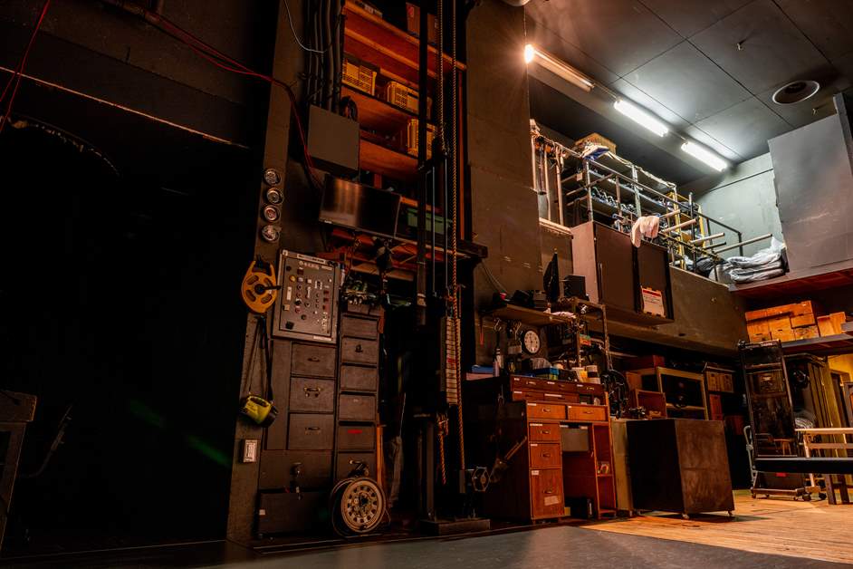 今回は特別に舞台の裏手も見せていただきました。機材などは置かれているものの、思った以上に広いのが印象的です。