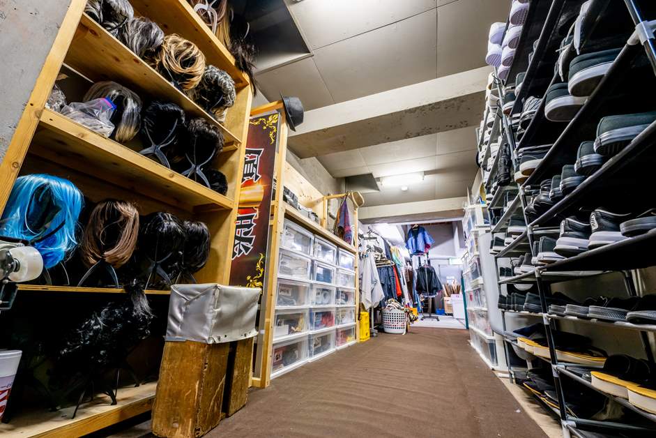 舞台の下には、コントで使用する衣装やカツラなども。コントを成立させるためには、様々な準備が必要なことがわかります。