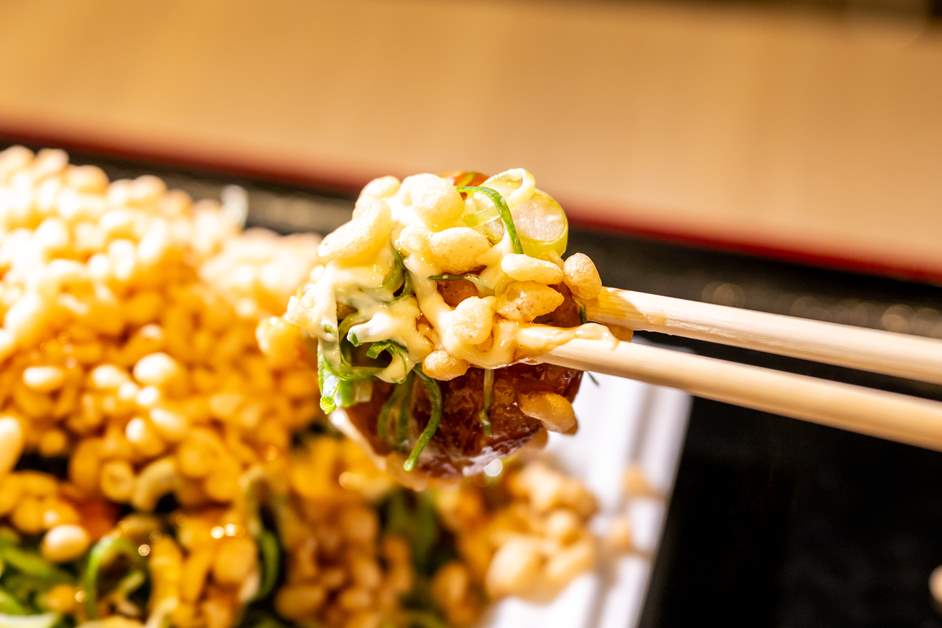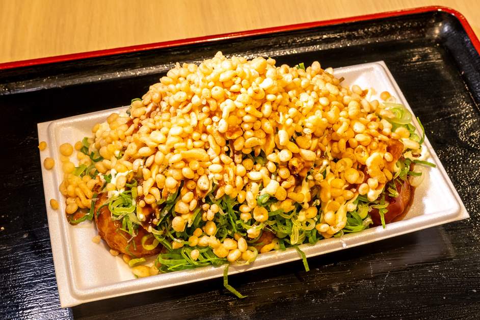 大阪の本店で提供している焼きそばにイカ天を使っていたことから、その組み合わせをたこ焼きにも応用したのが始まりだそう。イカ天のサクサクとした食感がたこ焼き表面のカリッとした食感とマッチ。一口ほおばると、たこ焼きの中からはトロリとした生地があふれ出し、そこに、シャキシャキとした新鮮なネギの清涼感と、マヨネーズのまろやかさが加わります。ガッツリと食べ応えがありながらも、後味は意外なほど軽やか。これなら何個でも食べられそうです。
