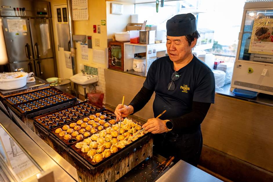 「くくる」の魅力は、味もさることながら、そのエンターテインメント性にあります。店頭では、長い目打ち(ピック)を巧みに操り、リズミカルにたこ焼きを返していく職人さんの姿を見ることができます。