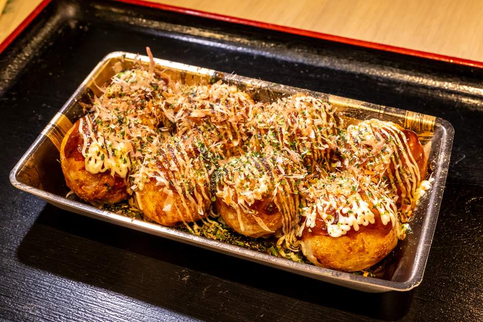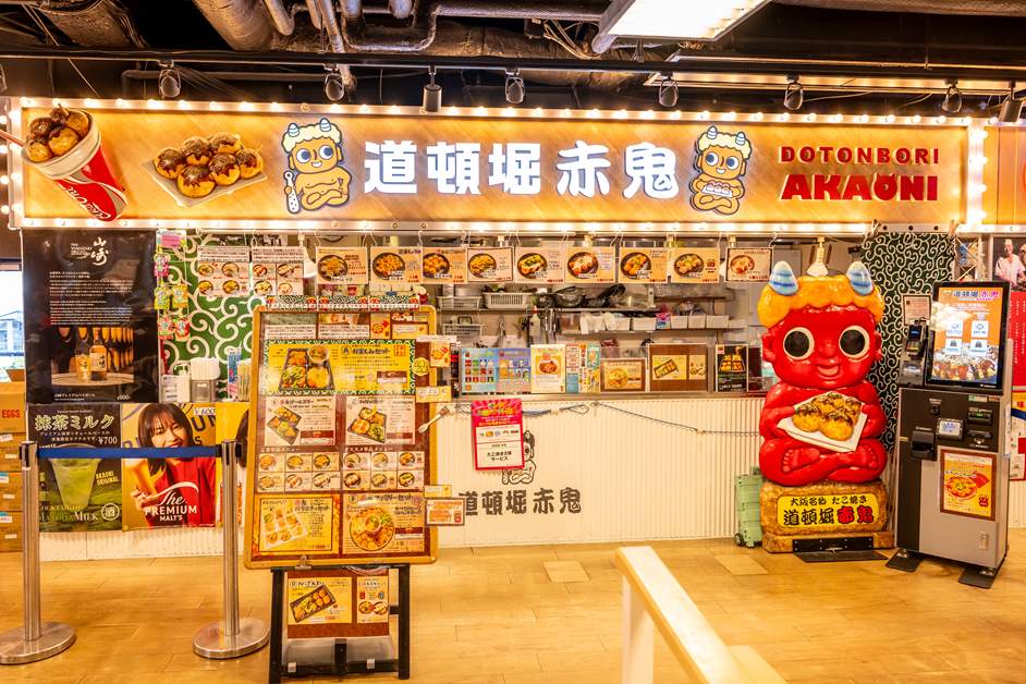 3軒目は、テレビや雑誌などでも度々取り上げられる人気店の「道頓堀 赤鬼」。店頭のキュートな赤鬼のキャラクターがお出迎えしてくれました。「粉もん文化を世界へ」をコンセプトに、バラエティ豊かなたこ焼きを提供しています。