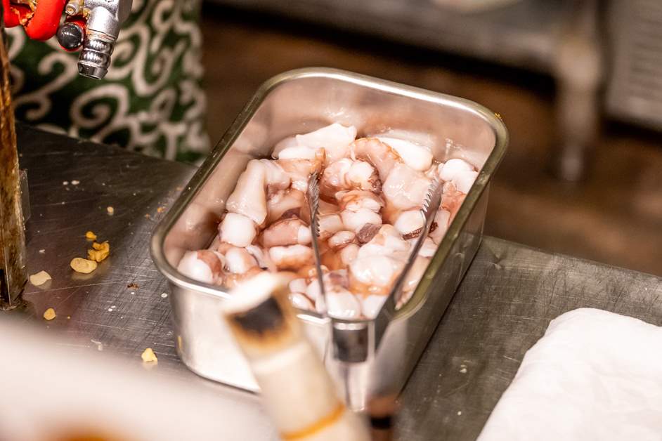 「赤鬼」の最大の特徴は使用する“タコ”にあります。基本的に、たこ焼きはボイルされた茹でダコを使用することが多いのですが、「赤鬼」では生ダコを使用。毎朝市場から仕入れた新鮮な生ダコをお店でカットし、生のまま生地に入れて焼き上げます。
