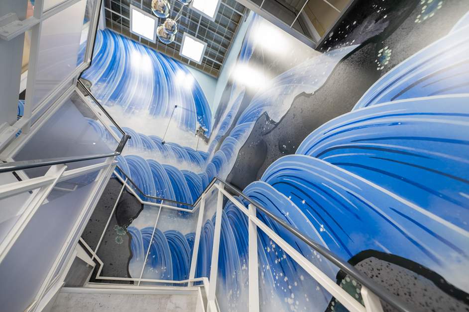 「GiGO六本木」で注目したいのは、その店内デザイン。2階から3階へ続く階段を登ろうとすると、高さ約6メートルという圧倒的なスケールの「滝の絵」が目に飛び込んできます。歌舞伎の名作「日本振袖始(にほんふりそではじ)」の背景画を再構成したもので、轟音とともに流れ落ちる水流と、そこから立ち上る生命力溢れる飛沫が、見事に表現されていました。