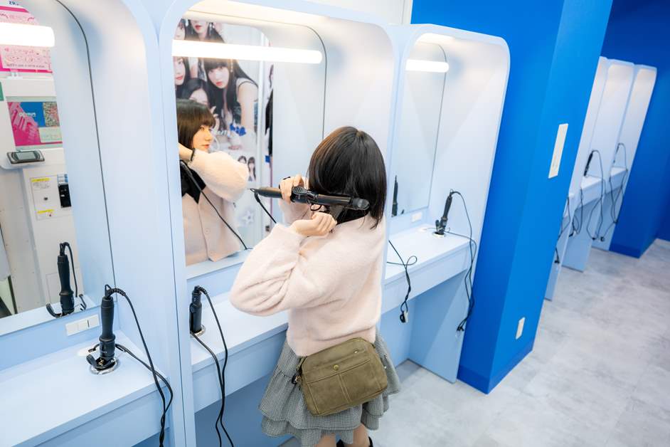 ここで村上さんが注目したのは、撮影ブースの横に設置されたドレッサーコーナー。「撮影前に前髪やメイクを直せるのは、女の子にとって本当に嬉しいポイントです!」と絶賛。大きな鏡はもちろん、ヘアアイロンまで備え付けられており、最高のコンディションで撮影に臨むことができます。