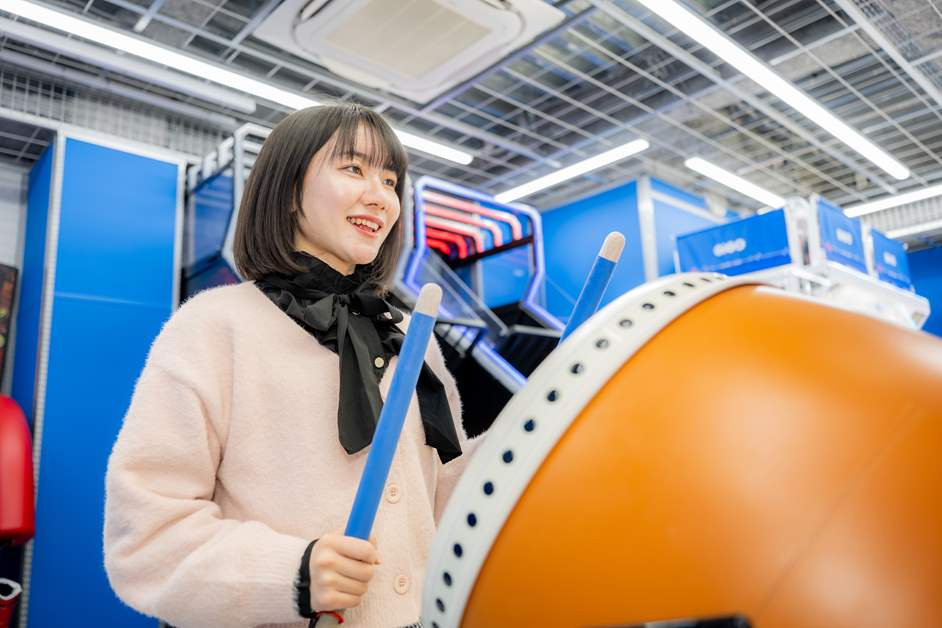 「太鼓の達人」でリズムよくバチを振るう村上さん