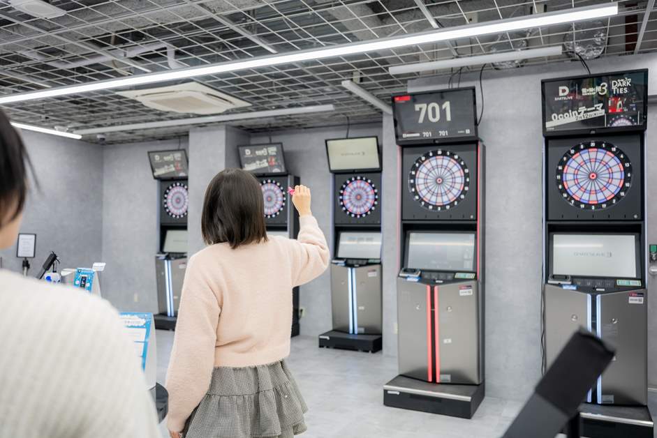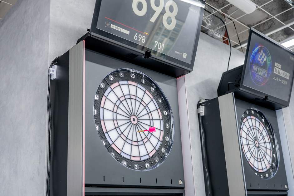 同フロアにあるダーツコーナーには5台の最新マシンを設置。一人でじっくり練習に打ち込む人もいれば、友人同士でわいわい楽しむグループもおり、それぞれのスタイルで贅沢な時間を過ごすことができます。