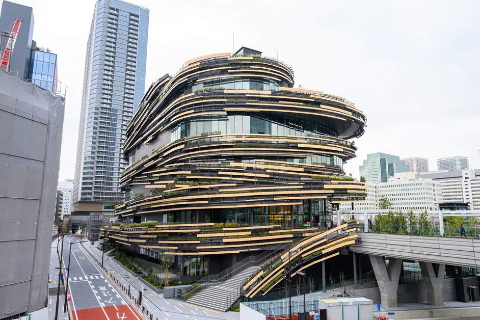 JR・高輪ゲートウェイ駅から、TAKANAWA GATEWAY CITY内のデッキを進むこと約5分。らせん状に空へと伸びていくような独創的な建物が見えてきます。外装デザインを担当したのは、世界的建築家の隈研吾建築都市設計事務所。外壁には、木材がふんだんに使用されており、植栽の緑も印象的。まるで巨大な切り株のようにも見えます。