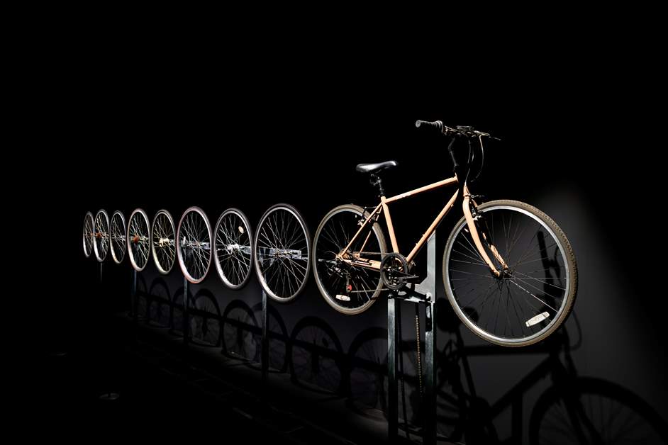 無数の自転車のホイールが連動して回転する立体作品。人の力が伝達されていく様子を可視化しています。