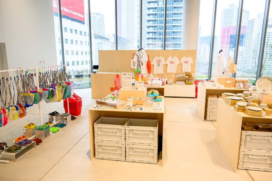 「ぐるぐる展」にはグッズショップも併設。Tシャツやバッグ、サンダルなど、セレクトリサイクルショップのPASS THE BATONとコラボしたアイテムが並びます。